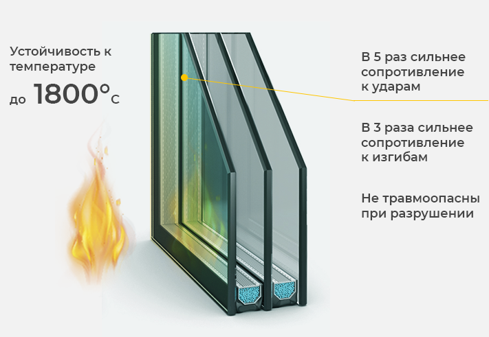 Это стеклопакеты повышенной прочности, которые производятся путем закалки стекла, при этом стекло получает повышенную в 5 раз прочность. Ударопрочные стеклопакеты устойчивы к температурным перепадам и физическим нагрузкам.