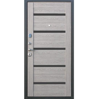 Вхідні металеві двері попіклуються не тільки про естетичне оформлення дверного пройому, але і про безпеку житла. Модель оснащена двома замками четвертого класу зломостійкості – основним (циліндровим) і додатковим (сувальдним), нічною защіпкою, глазком широкого огляду. Ззовні двері покрита атмосферостійким складом – срібний антік, всередині – царговою МДФ-панеллю зі вставками з білого матового акрилата.